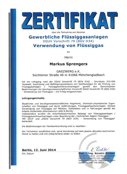 Ab sofort prüfen wir Ihre gewerblichen Flüssiggasanlagen auf Märkten, z.B. Volksfesten, Fahrzeugen und in der Gastronomie gemäß BGV D34. Informationen zur Ausbildung finden Sie hier.